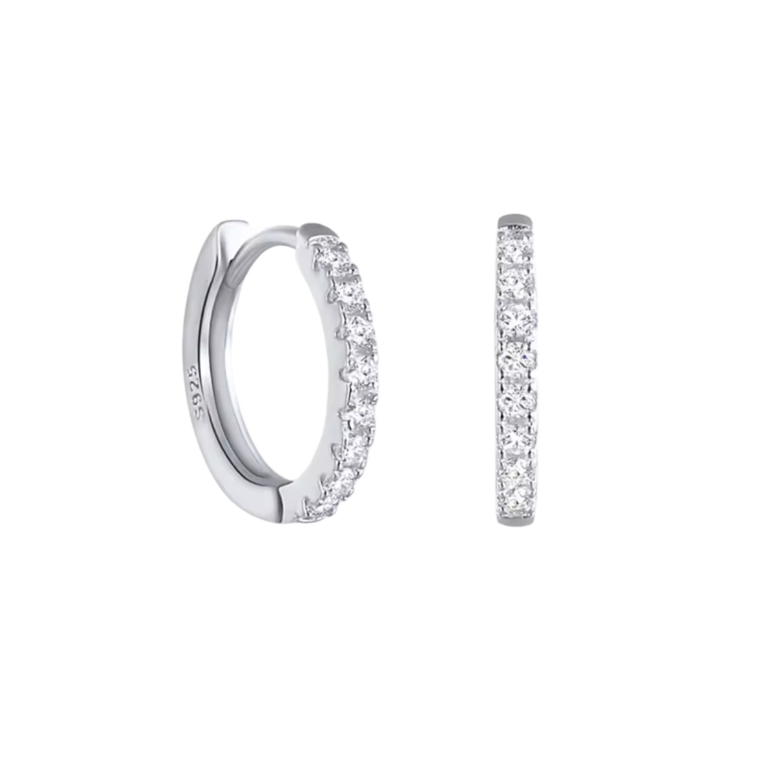 Pavé huggie hoop earrings crafted in 925 sterling silver and set with simulated diamond stones. A sleek, close-to-ear design that delivers refined sparkle for everyday wear.